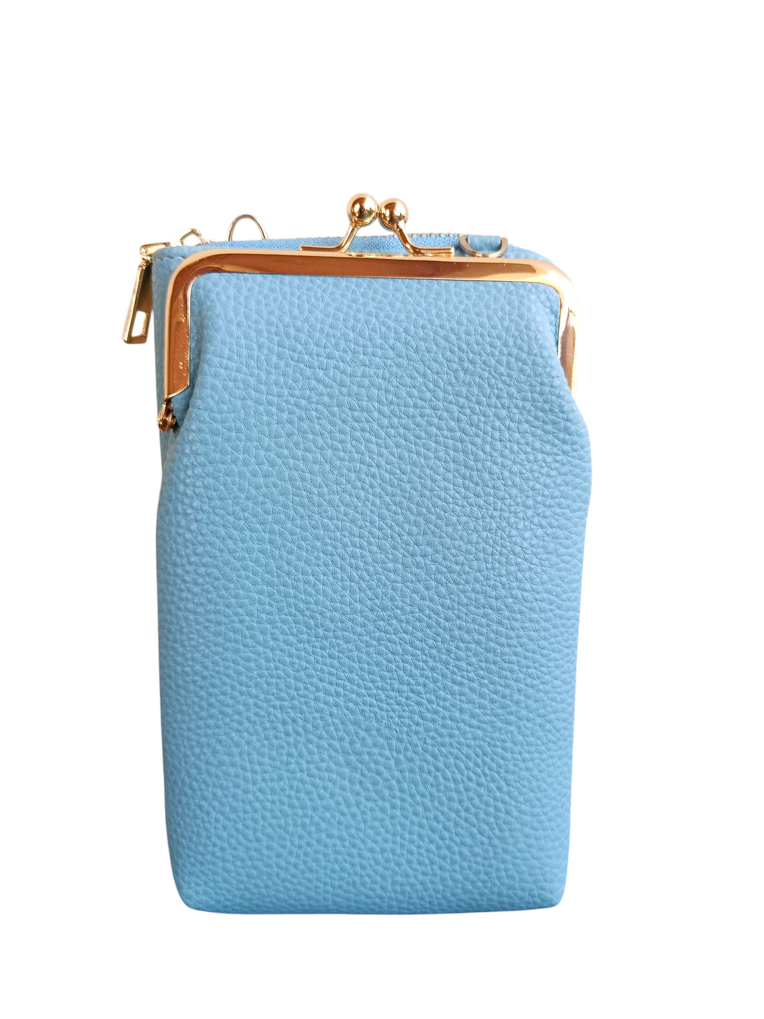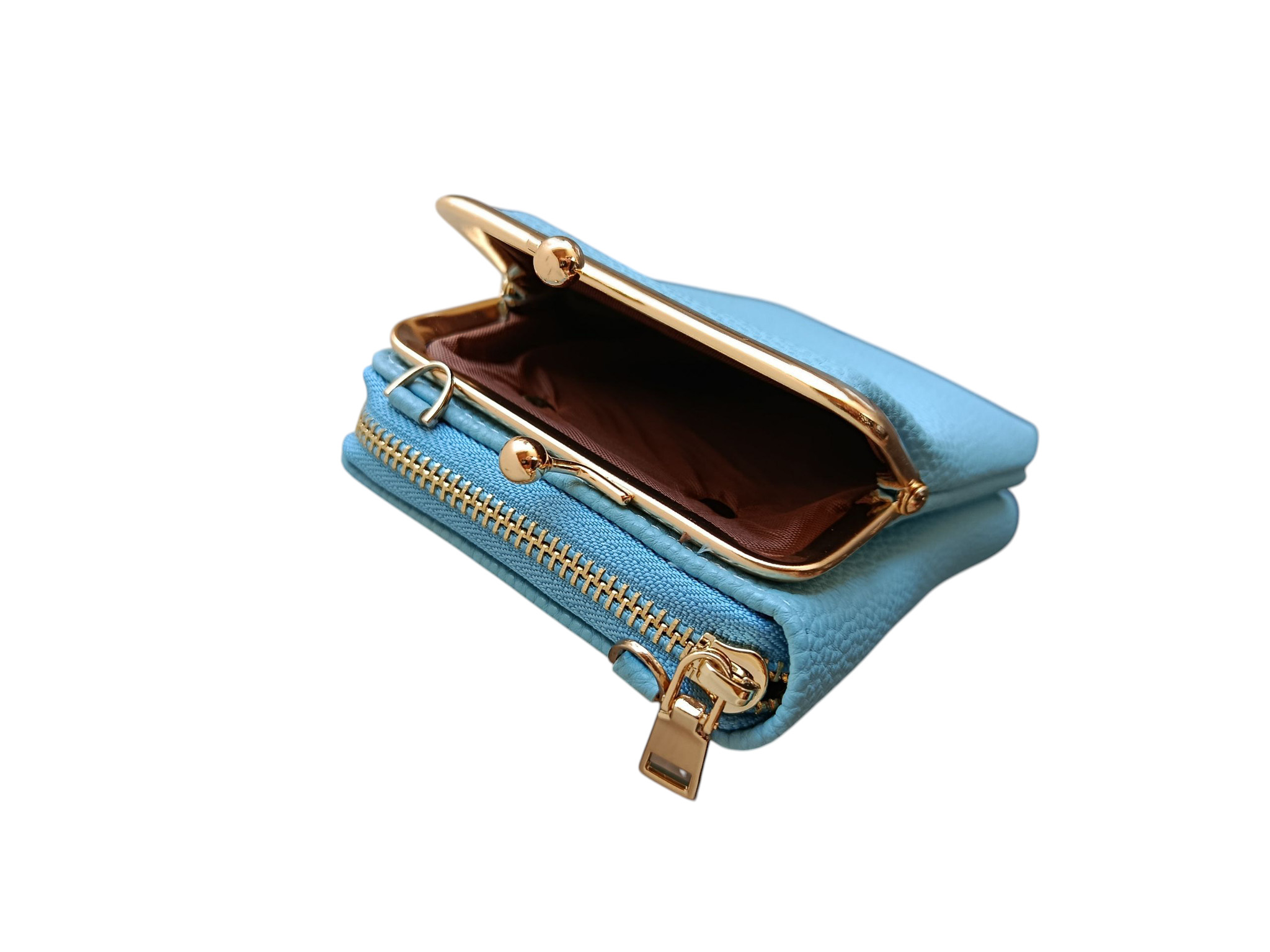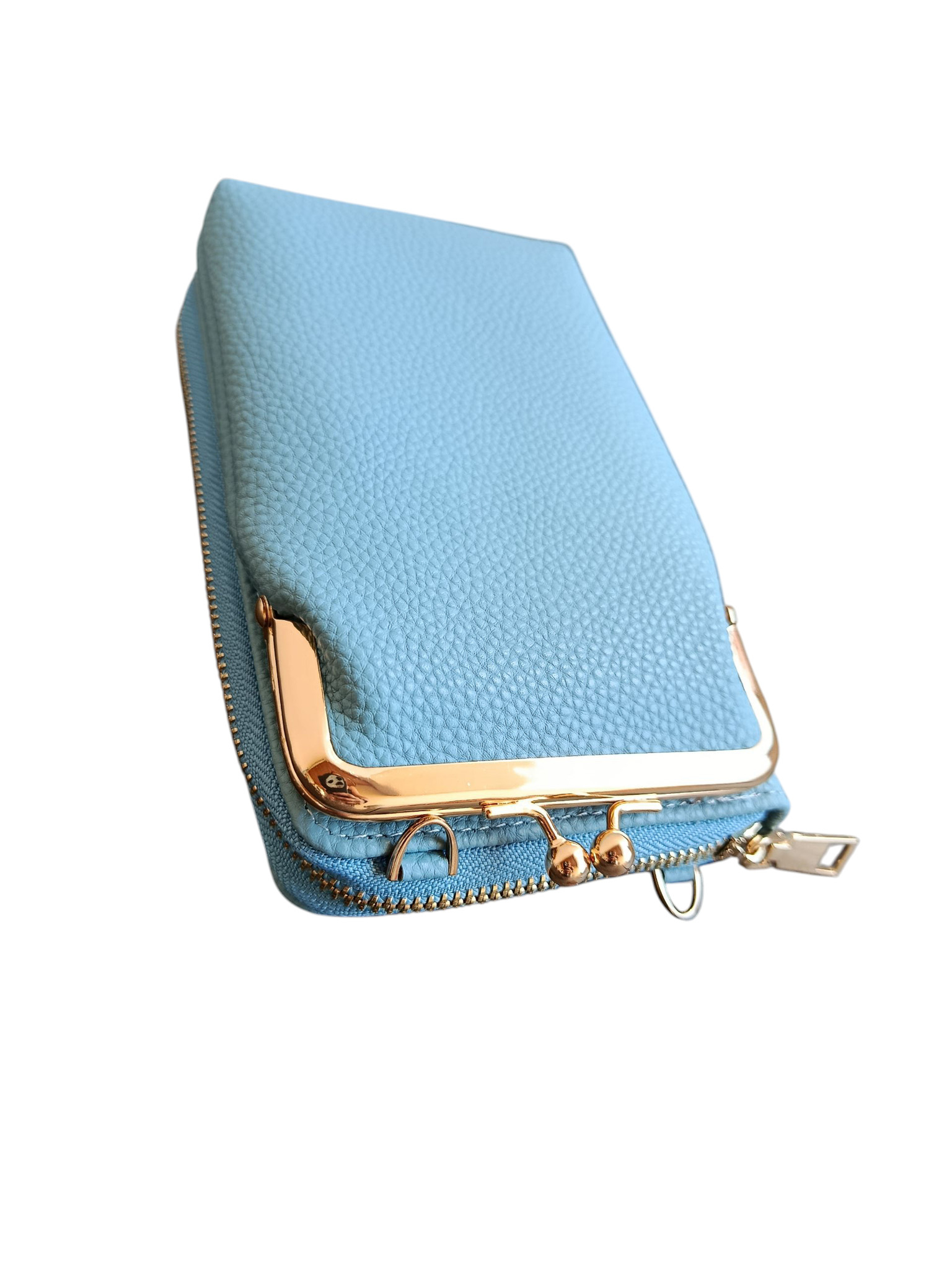 Γυναικείο τσαντάκι χιαστί γαλάζιο με θήκη για κινητό που μετατρέπεται σε ομορφο και πρακτικό πορτοφόλι. Διαθέτει δύο χώρους για τα χαρτονομίσματα , θήκη με φεερμουάρ για τα κέρματα και θήκες για κάρτες.