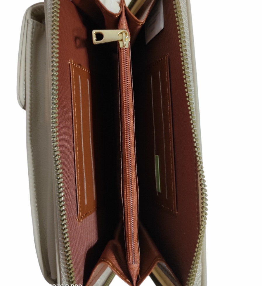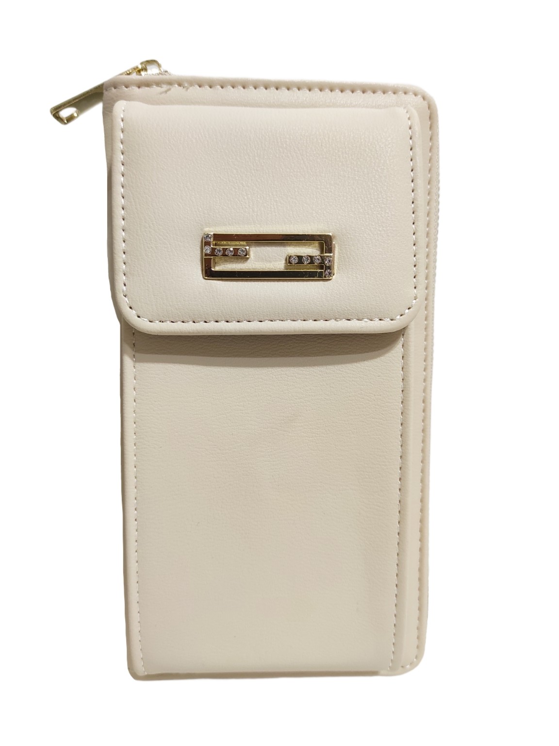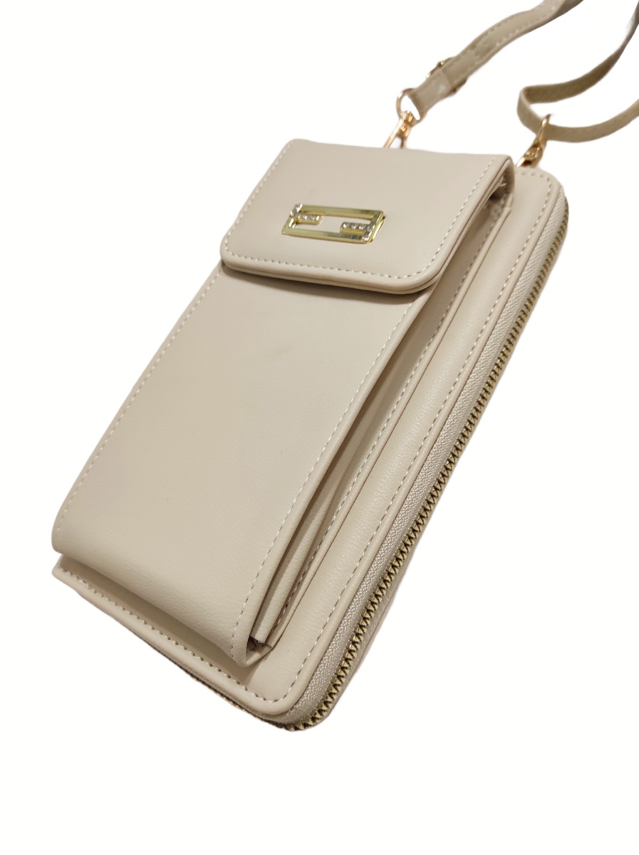 Γυναικείο πορτοφόλι μπεζ χρώμα, με μεταλλική λεπτομέρεια και διακοσμητικά στρας, με θήκη για κινητό που μετατρέπεται σε ομορφο χιαστί τσαντάκι. Διαθέτει δύο χώρους για τα χαρτονομίσματα , θήκη με φερμουάρ για τα κέρματα και θήκες για κάρτες.