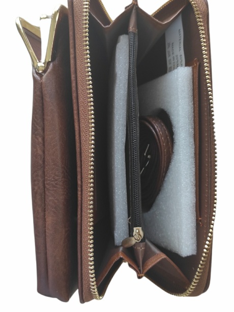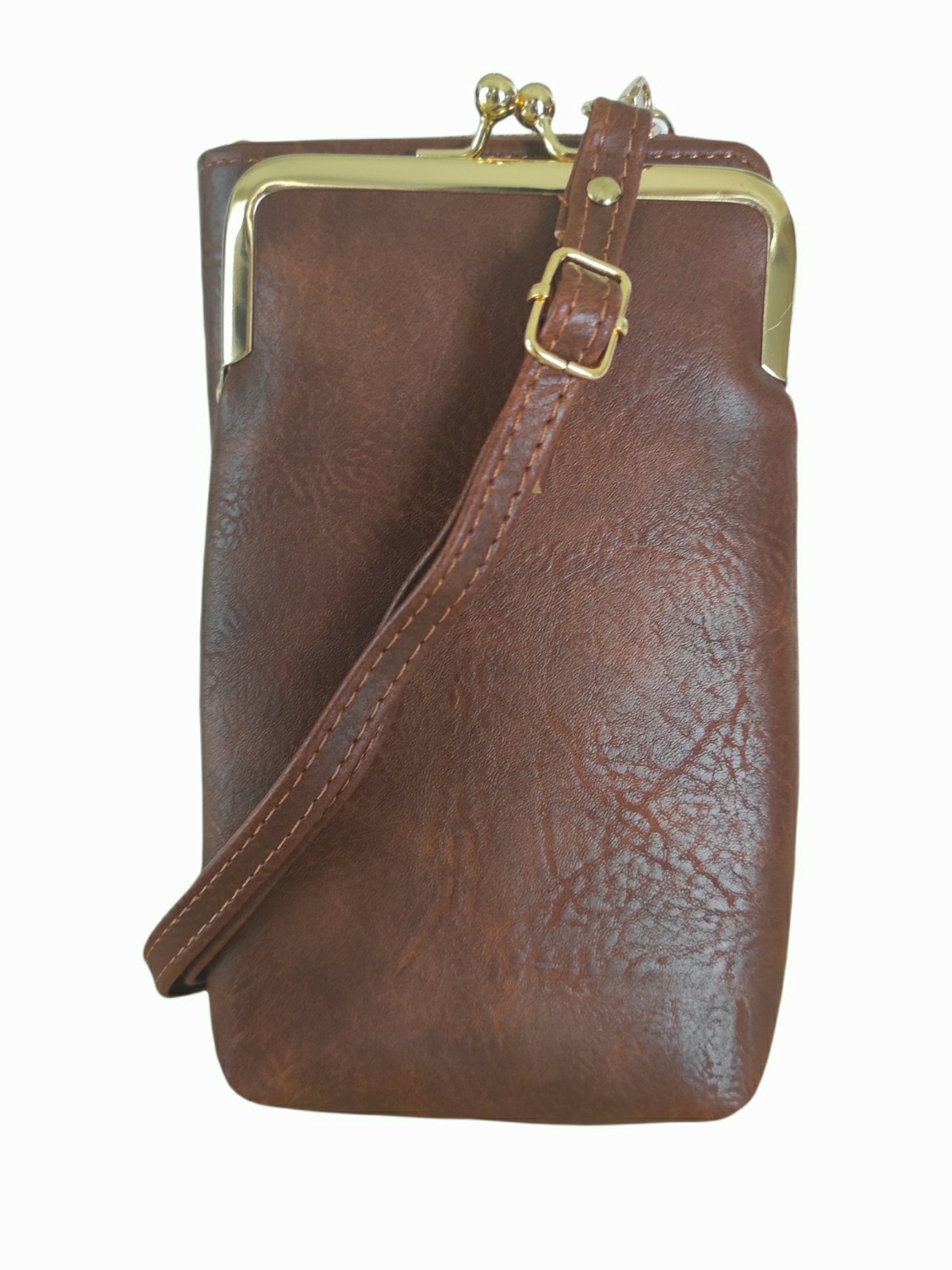 Γυναικείο τσαντάκι χιαστί καφέ με θήκη για κινητό που μετατρέπεται σε ομορφο και πρακτικό πορτοφόλι. Διαθέτει δύο χώρους για τα χαρτονομίσματα , θήκη με φεερμουάρ για τα κέρματα και θήκες για κάρτες.