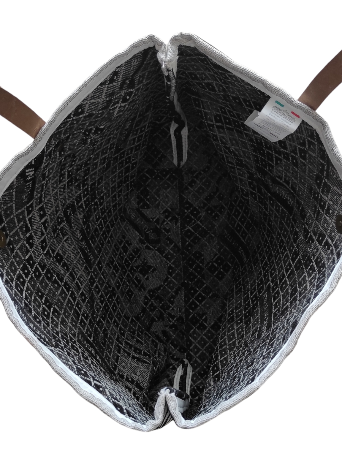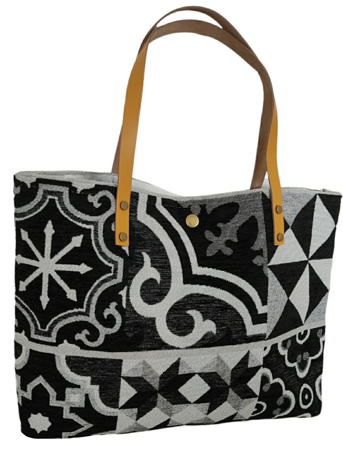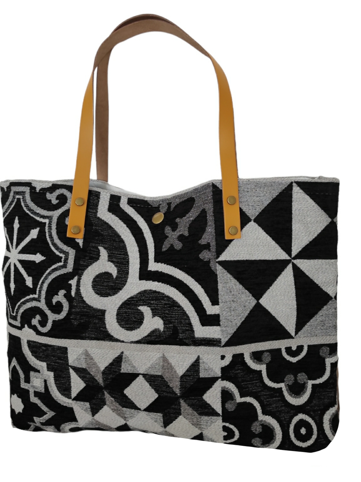 Γυναικεία τσάντα υφασμάτινη σαν υφαντή μαύρη και λουρακια από δερματίνη.Ενιαίος εσωτερικός χώρος