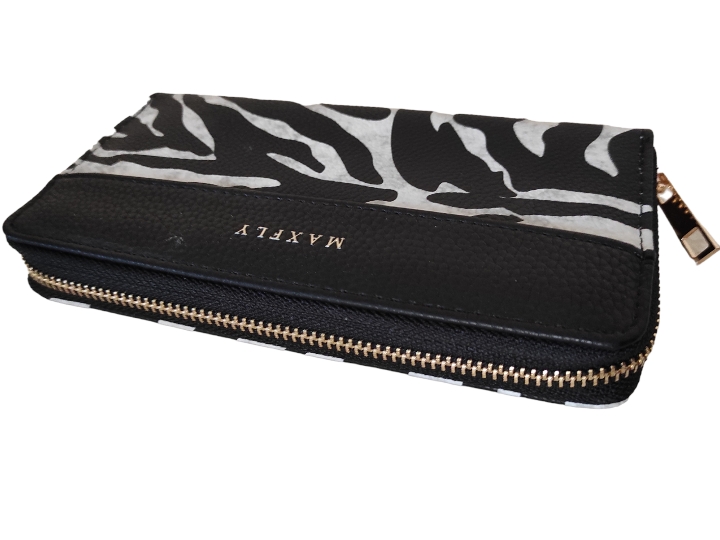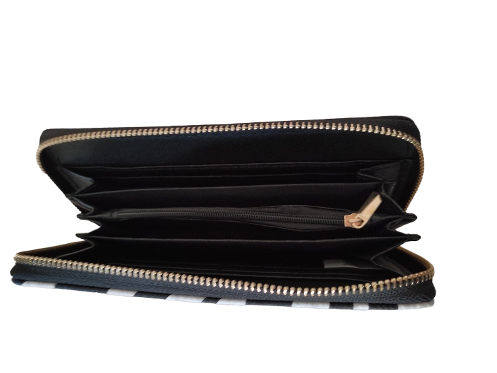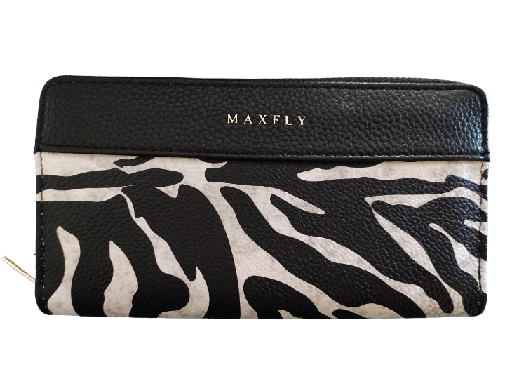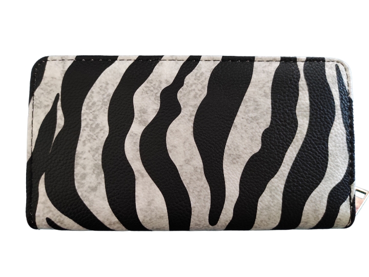 Γυναικείο πορτοφόλι ασπρόμαυρο με animal print σχέδιο. Διαθέτει εσωτερικά θήκες για χαρτονομίσματα, για κάρτες και μία θήκη με φερμουάρ για τα κέρματα.