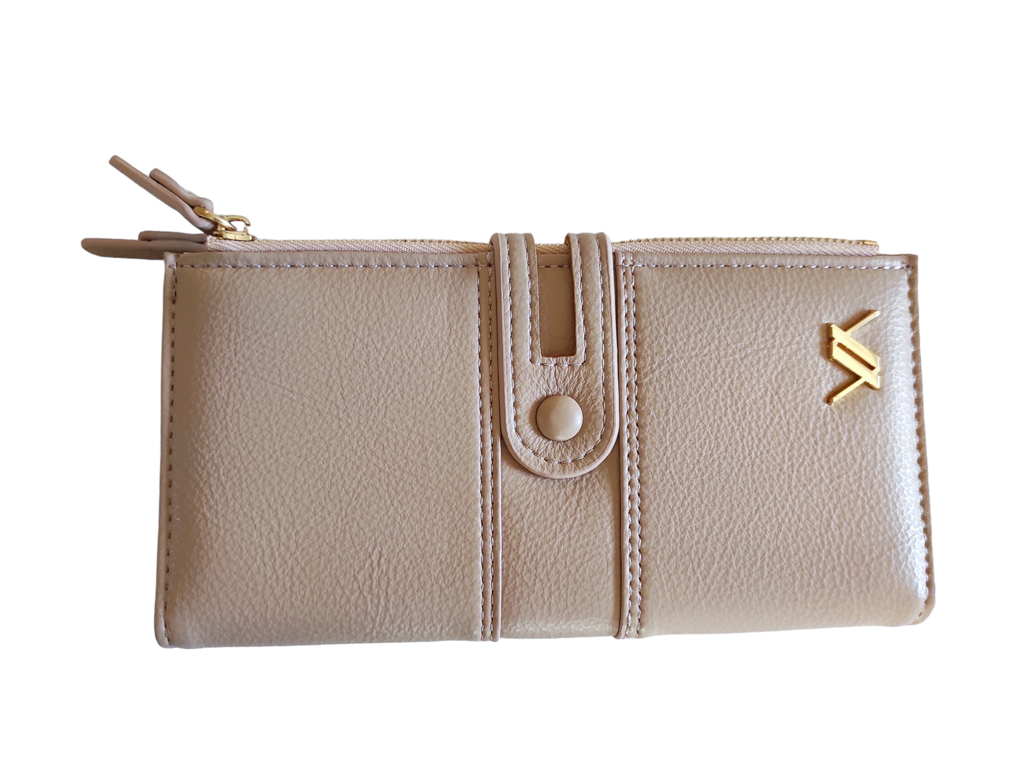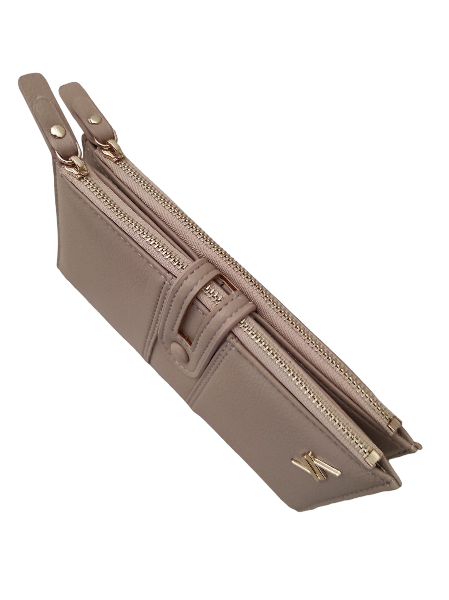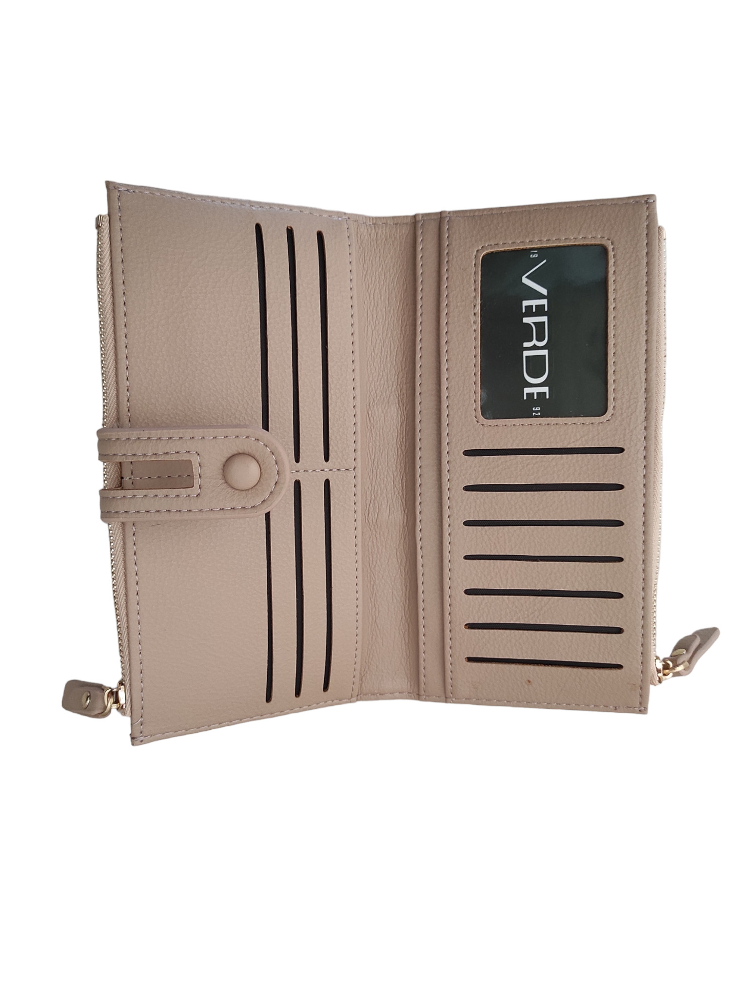 Γυναικείο πορτοφόλι verde μπεζ χρώμα. Διαθέτει δύο μεγάλες θήκες με φερμουάρ καθώς και εξωτερικό τσεπάκι στο πίσω μέρος.Εσωτερικά υπάρχουν τρεις μεγάλες θήκες και μικρότερες θέσεις για κάρτες.