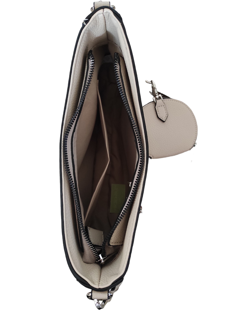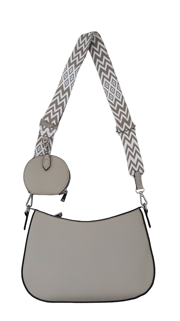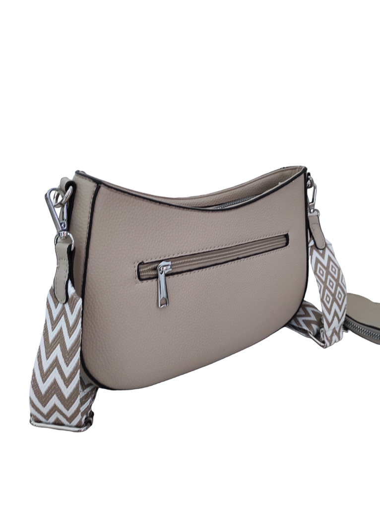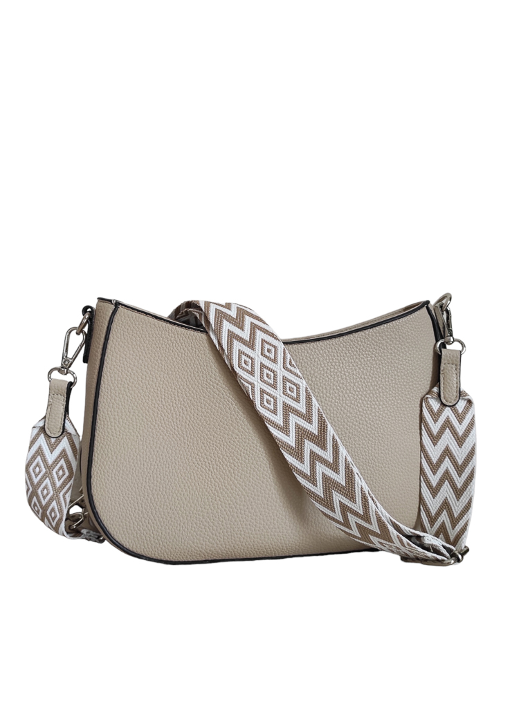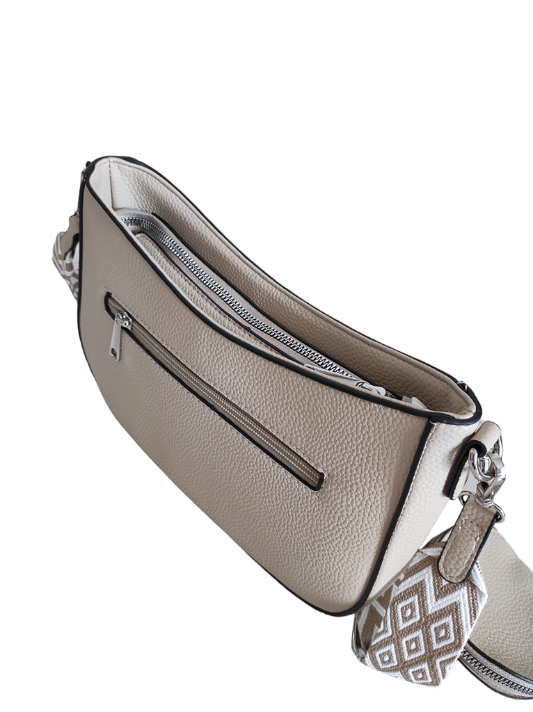 Γυναικείο τσαντάκι χιαστί μπεζ της άμμου χρώμα με ιμάντα.Ενιαίος εσωτερικός χώρος με μικρά τσεπάκια εντός.