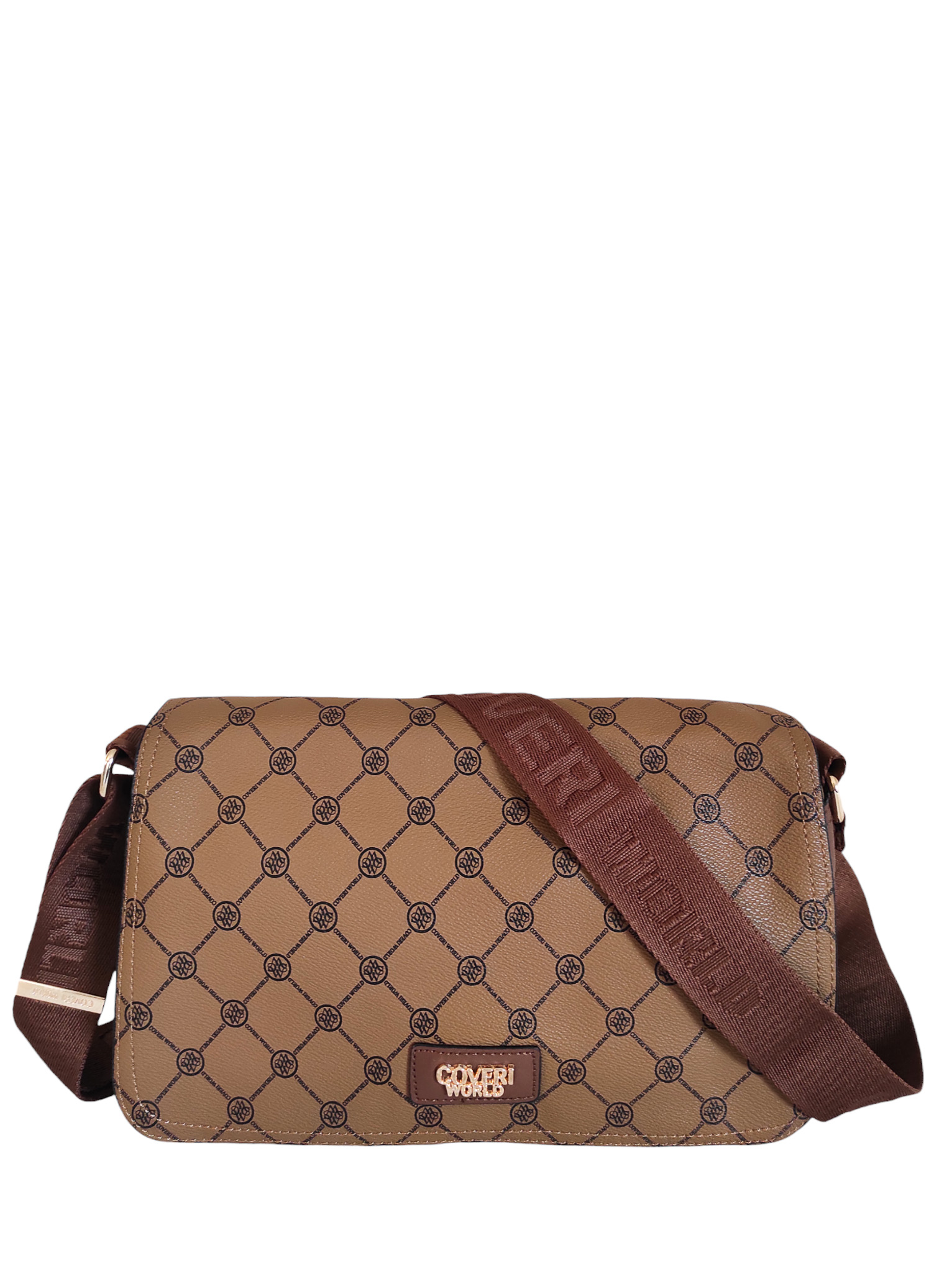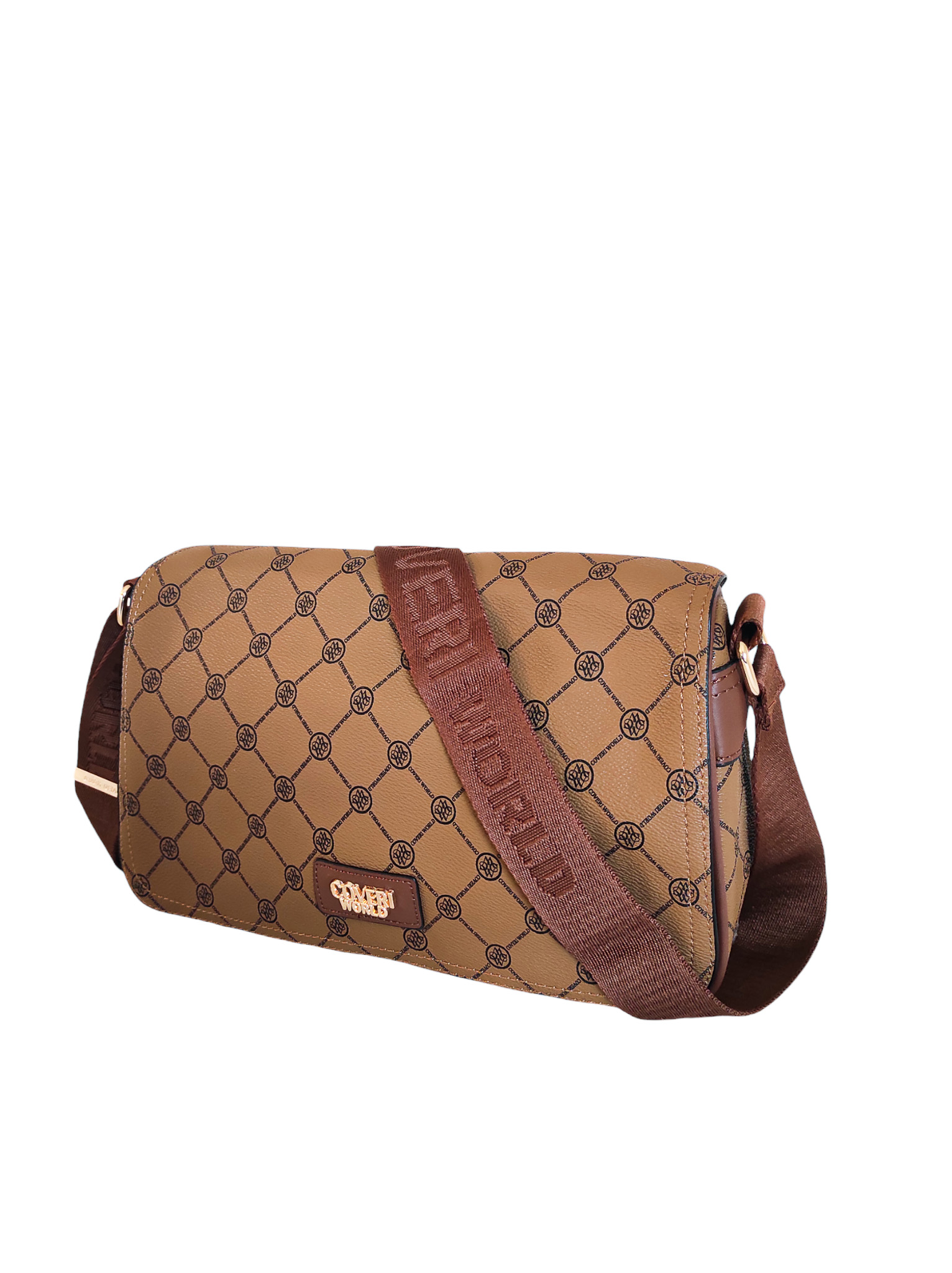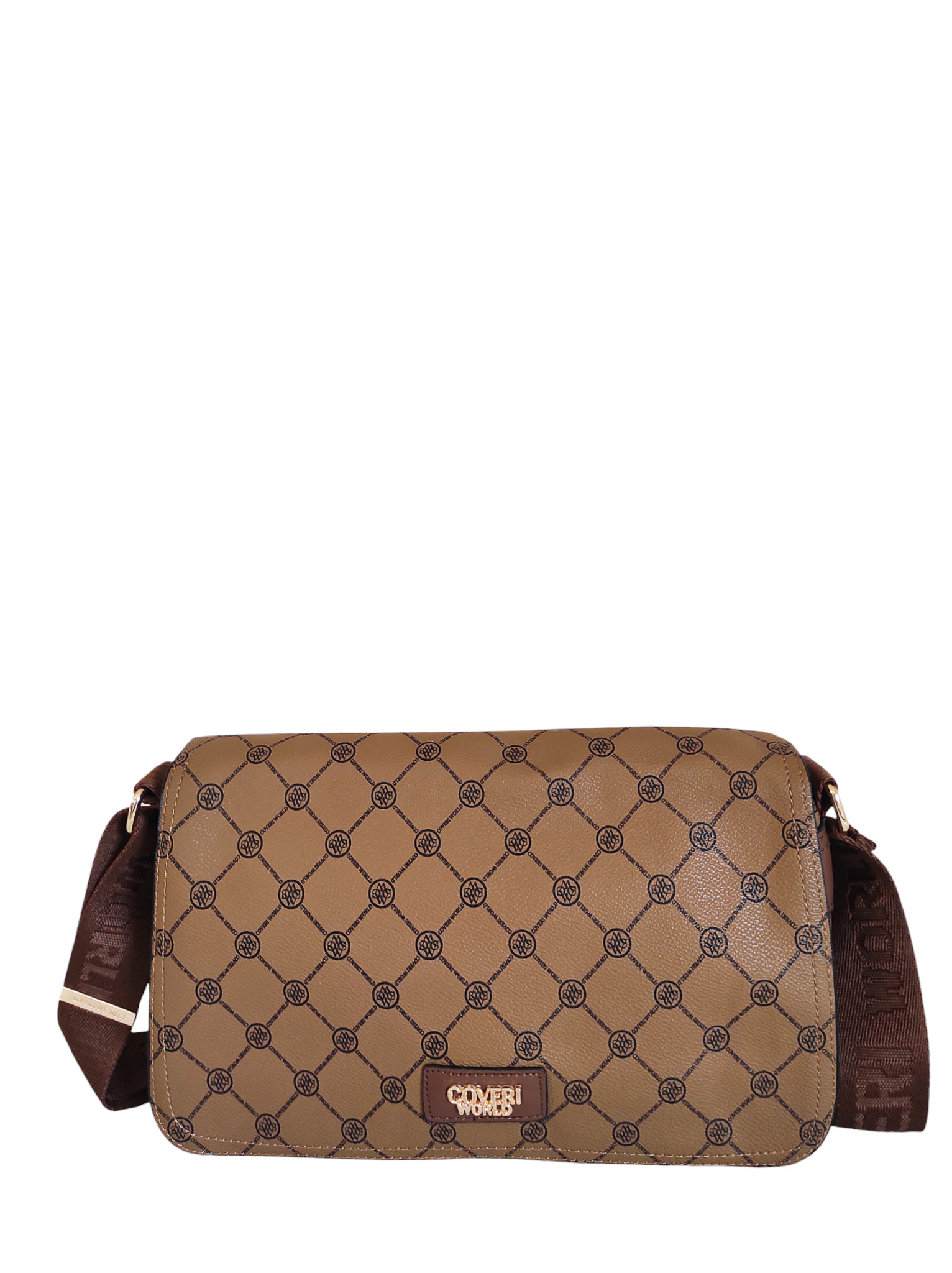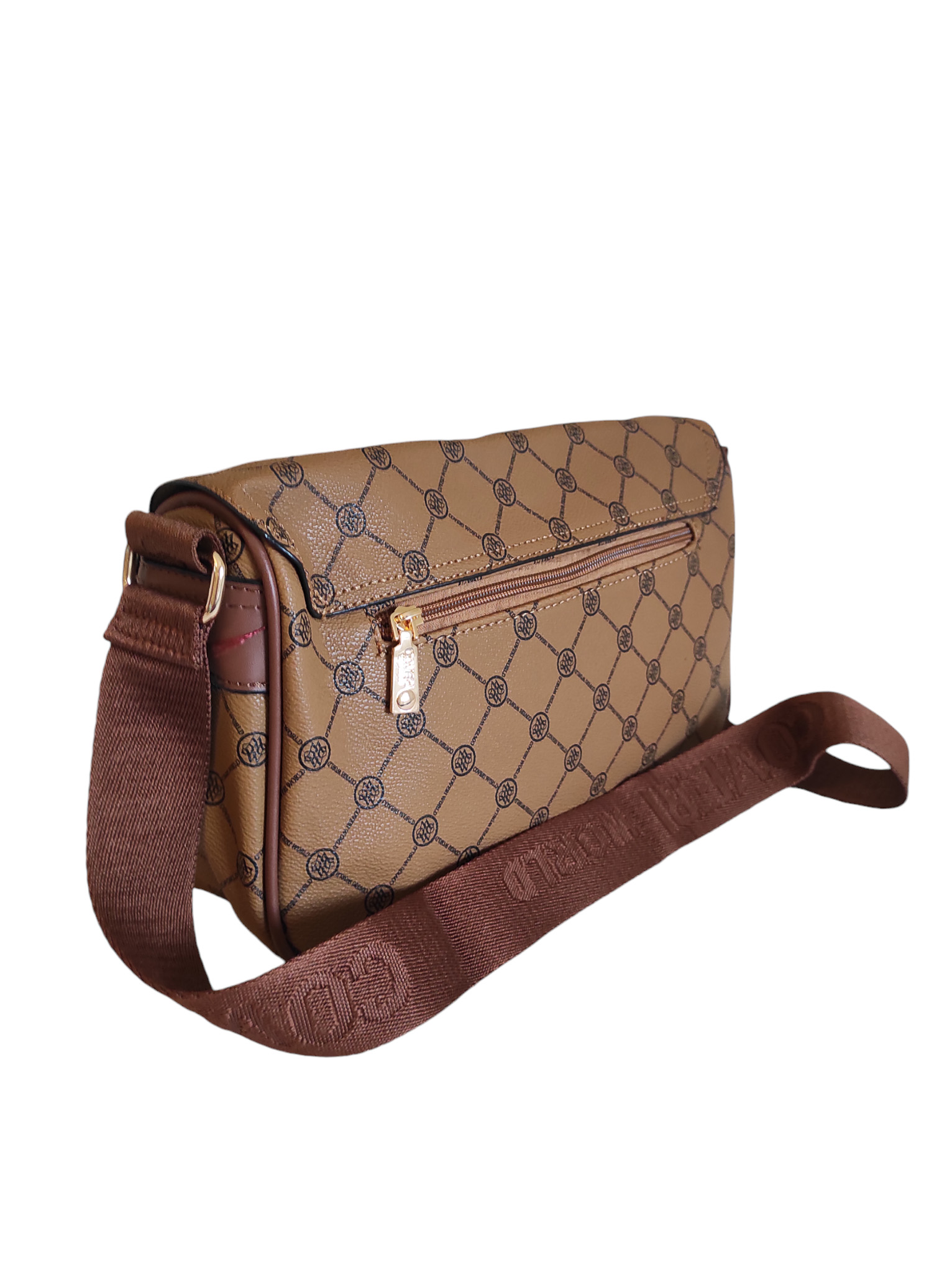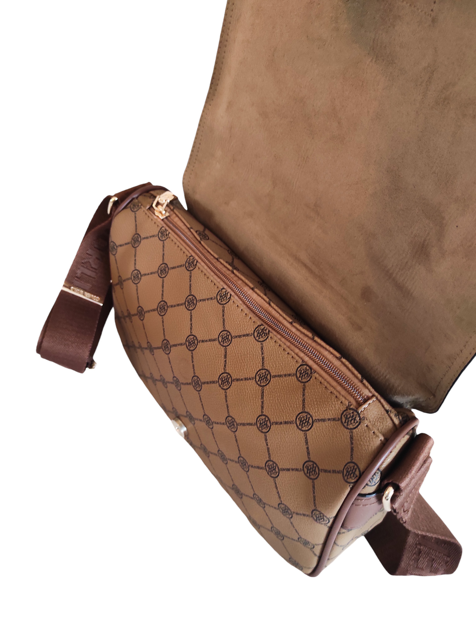 Γυναικεία τσάντα χιαστί με αυξομειώμενο ιμάντα ,καφέ χρώμα.Ενιαίος εσωτερικός χώρος με μικρά τσεπάκια εντός και θήκη με φερμουάρ στο πίσω μέρος της τσάντας.