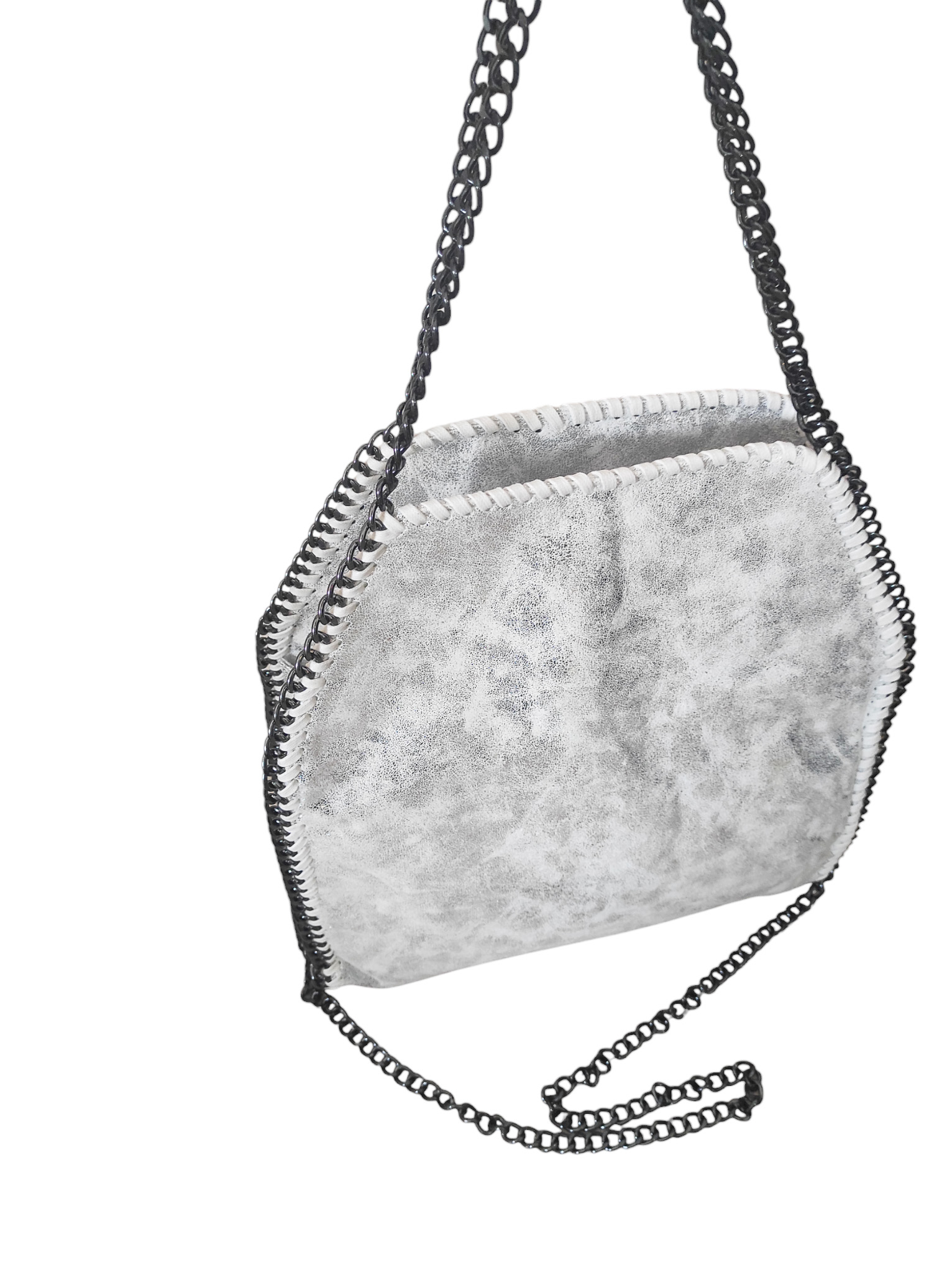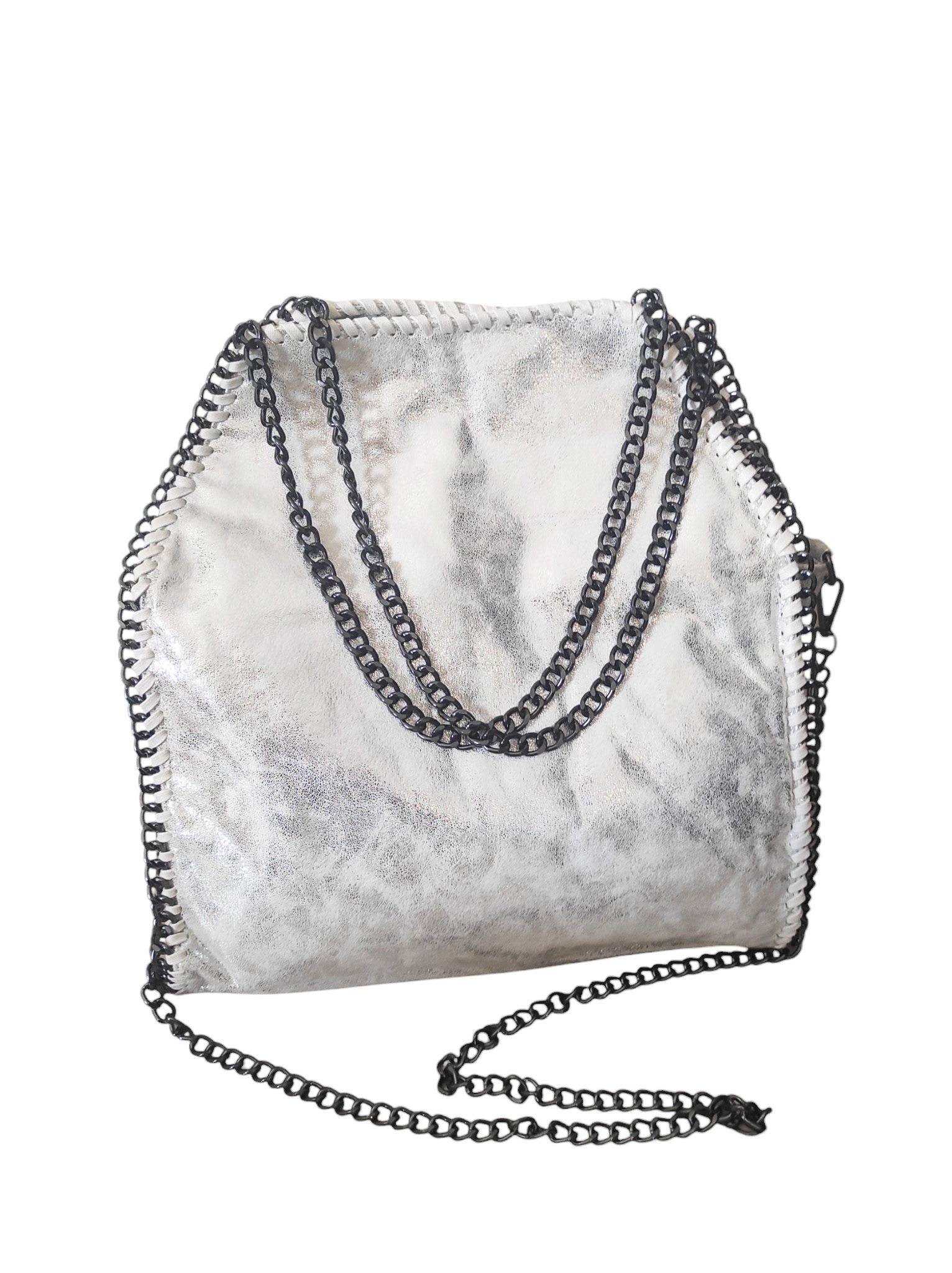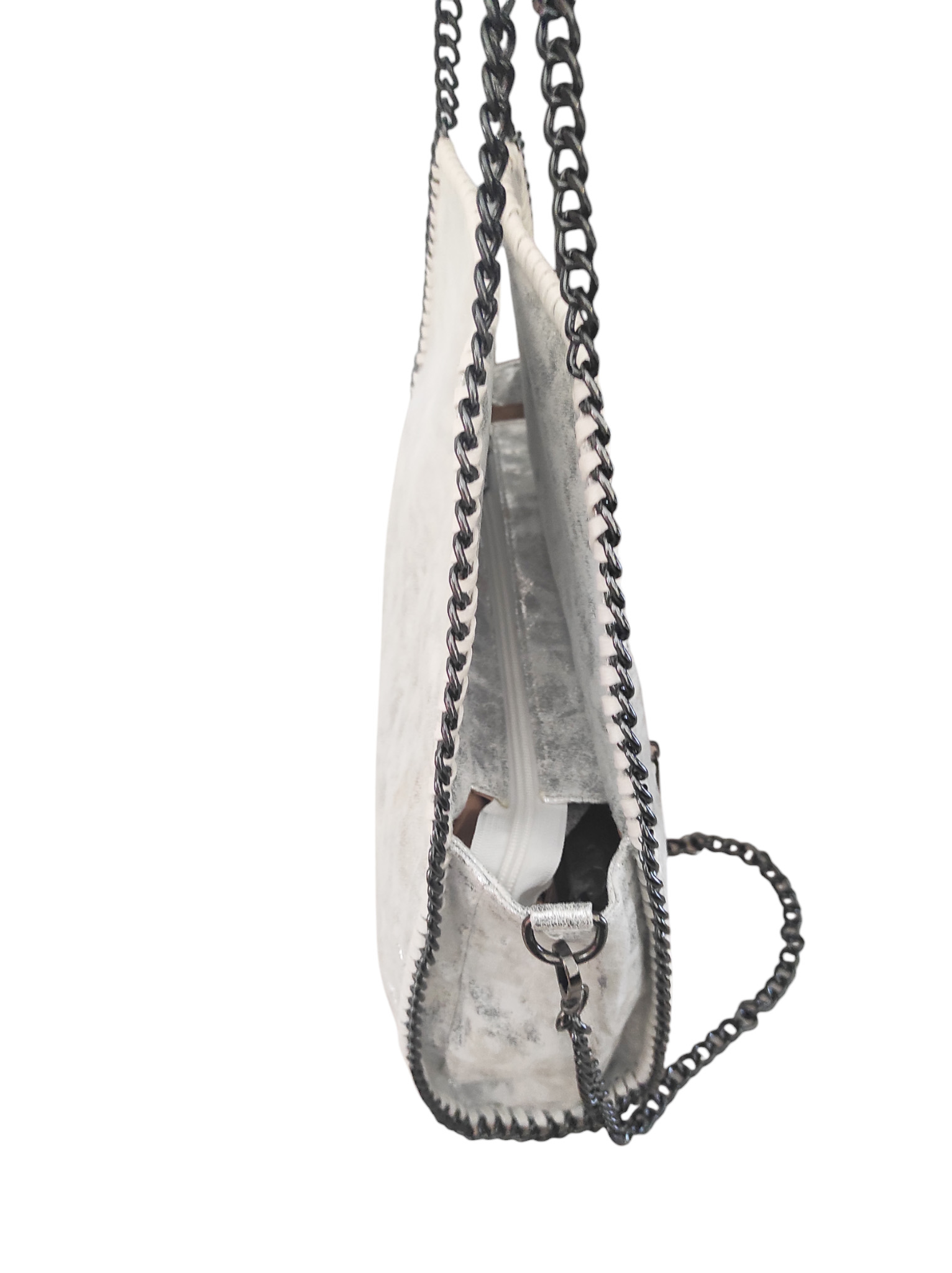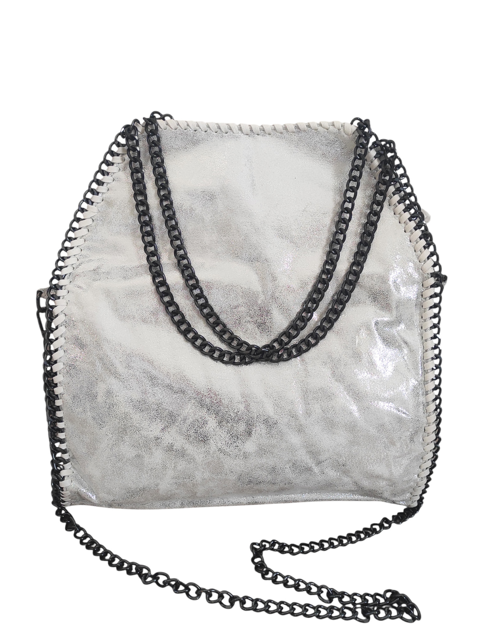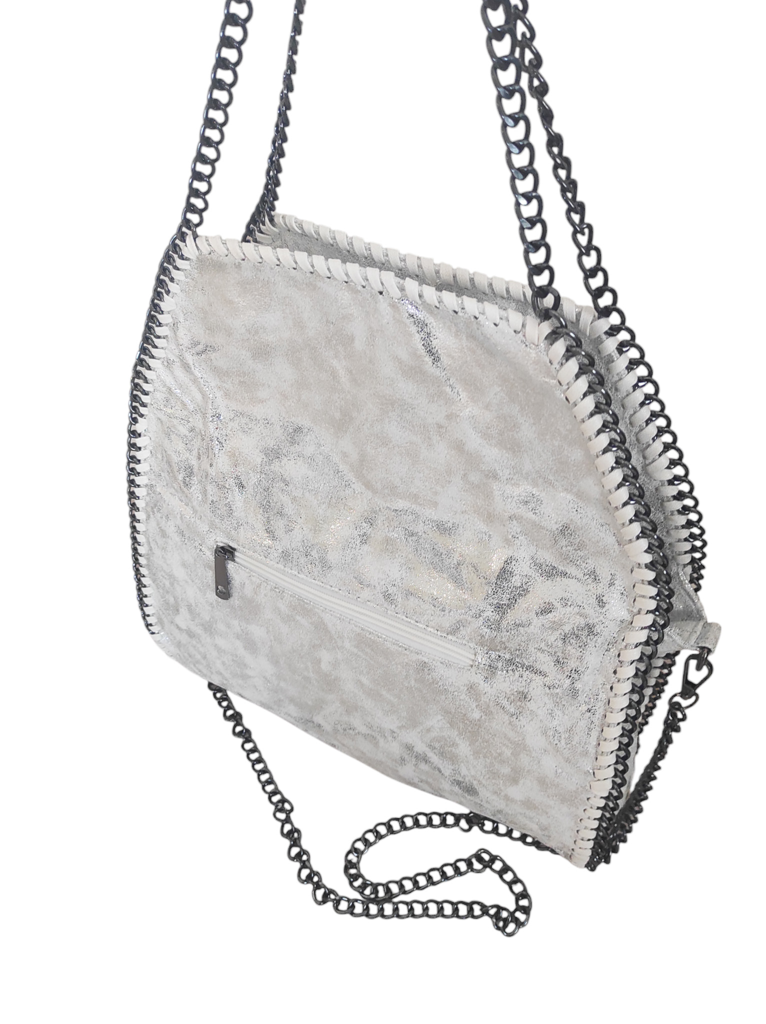Γυναικεία τσάντα ώμου και χειρός λευκό με ασημί χρώμα με ανθρακί αλυσίδες .Ο εσωτερικός χώρος χωρίζεται σε τρία μέρη ,το ένα εκ των οποίων με φερμουάρ. ΜΙκρά τσεπάκια εντός κι ένα με φερμουάρ στο πίσω μέρος της τσάντας.