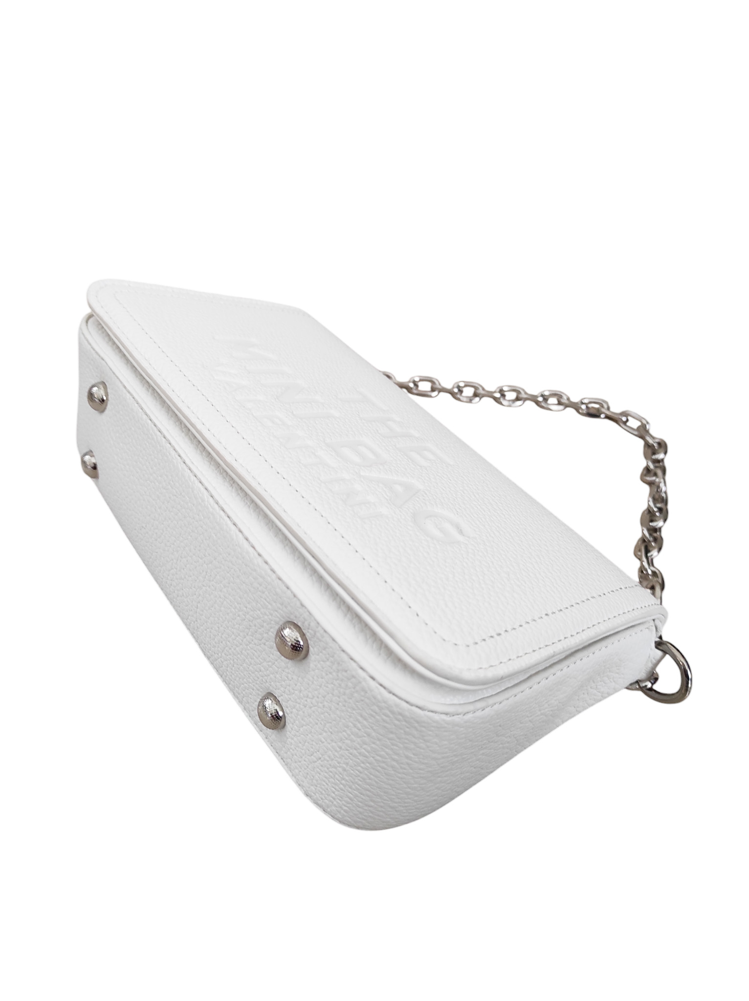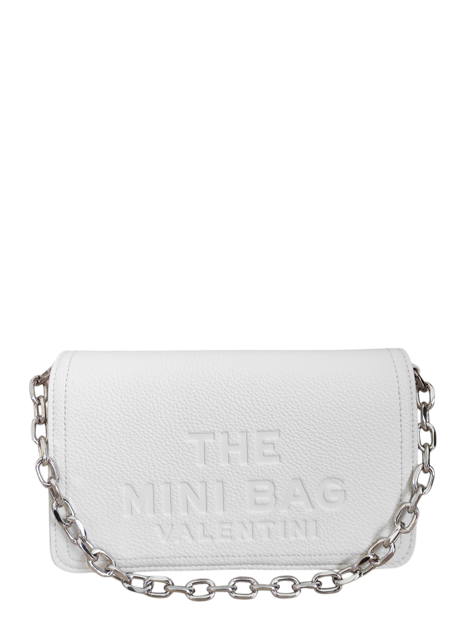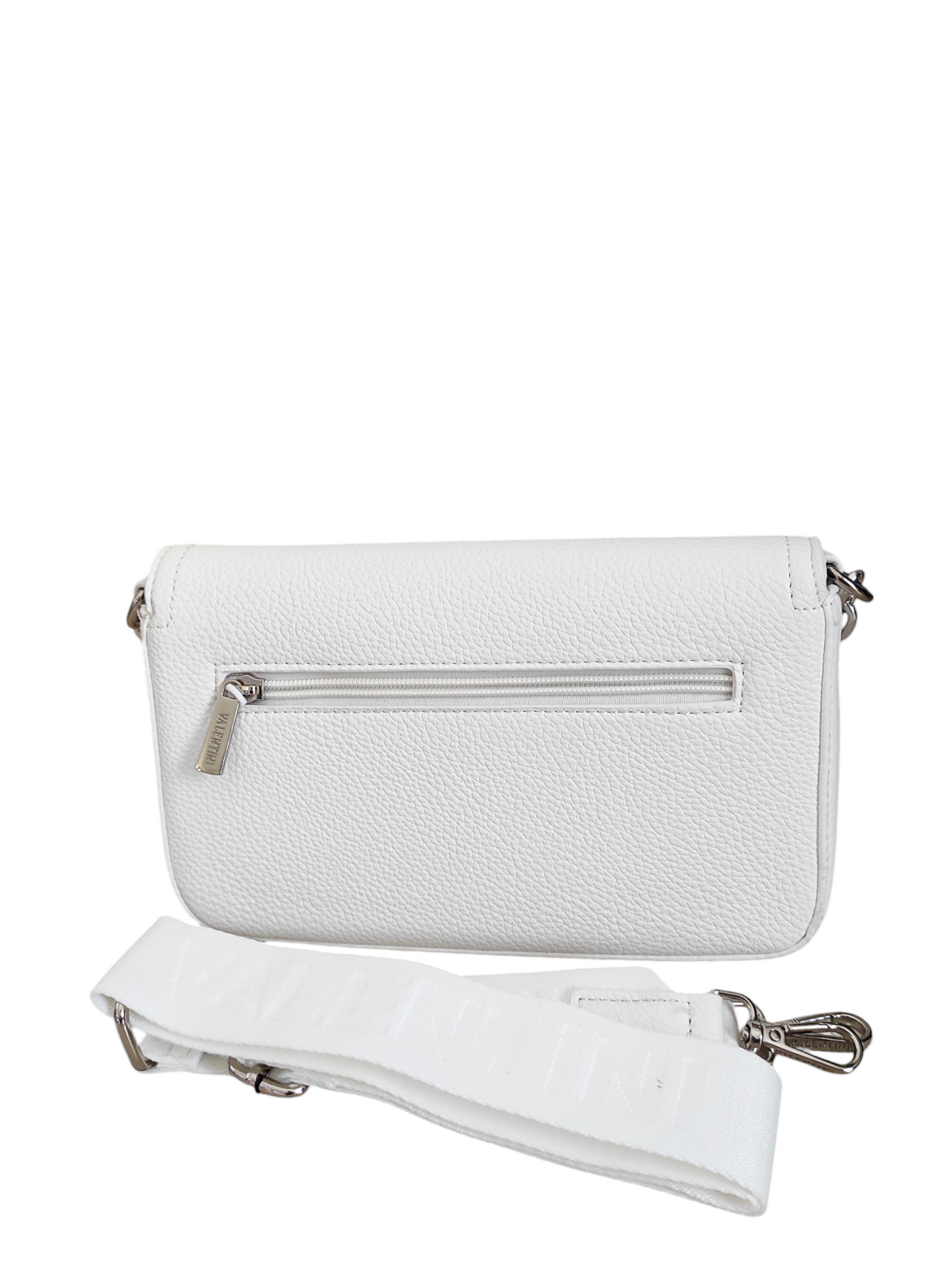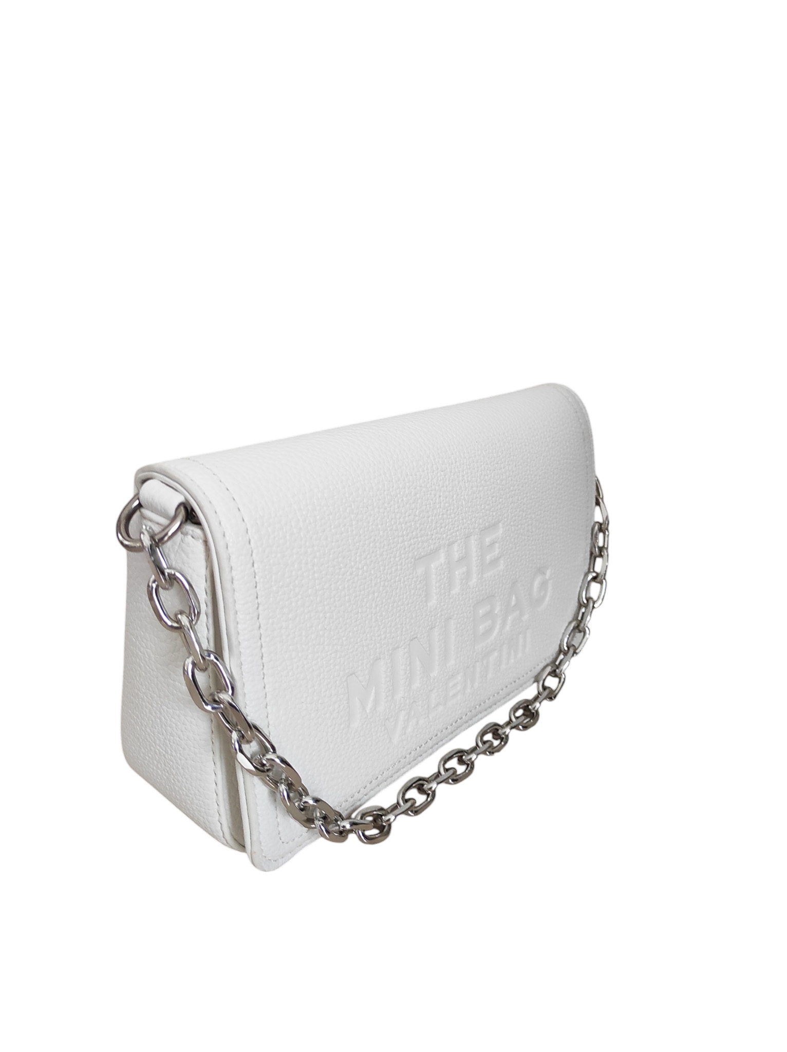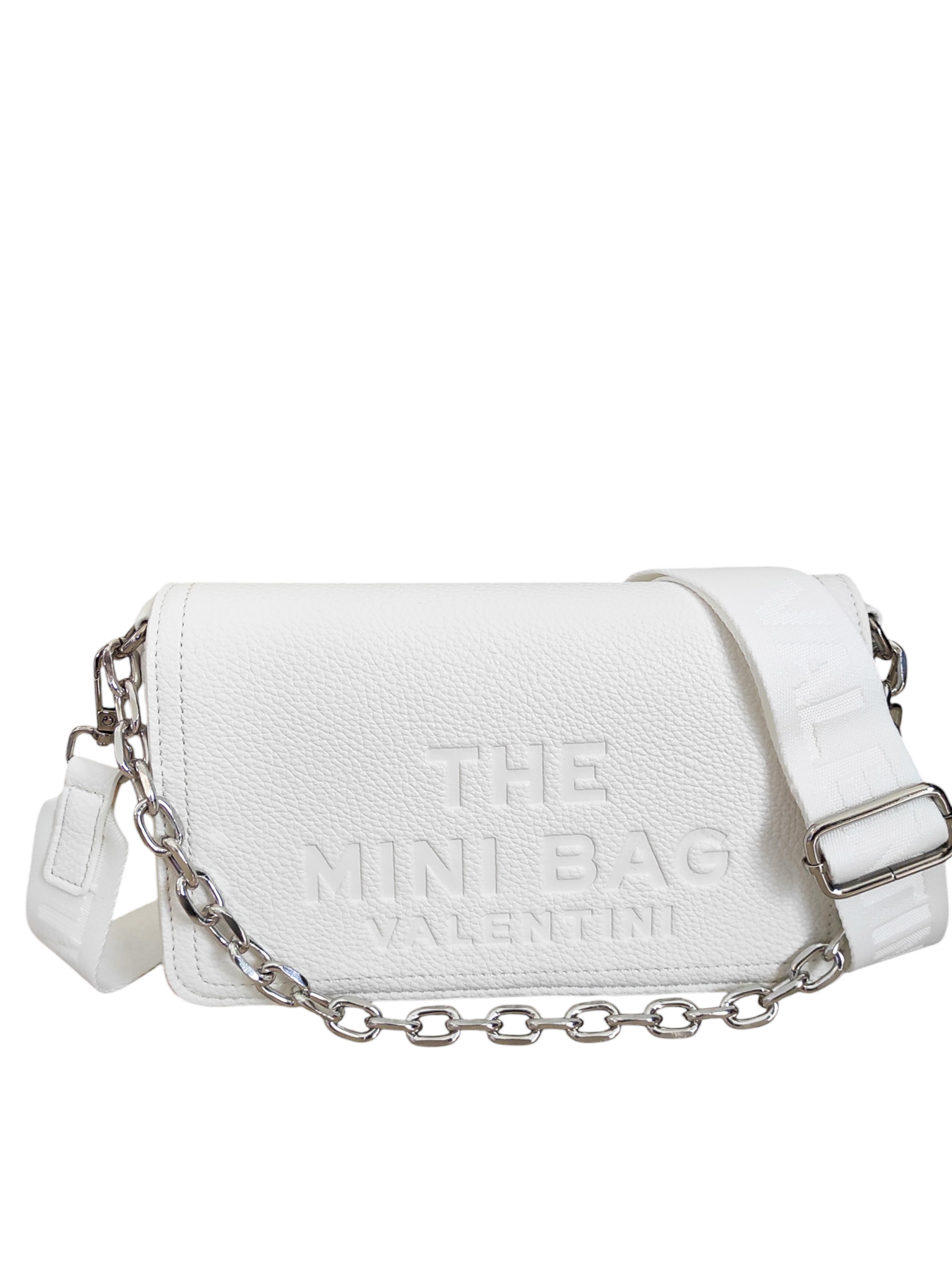 Γυναικεία τσάντα λευκό χρώμα με αλυσίδα ασημί για να την κρατ;hσεις στον ώμο ή στο χέρι ,αλλά κξαι αυξομειώμενο ιμάντα για να φορεθεί χιαστί..Ενιαίος εσωτερικός χώρος με θήκες εντός.Τσέπη με φερμουάρ στο πίσω μέρος της τσάντας .