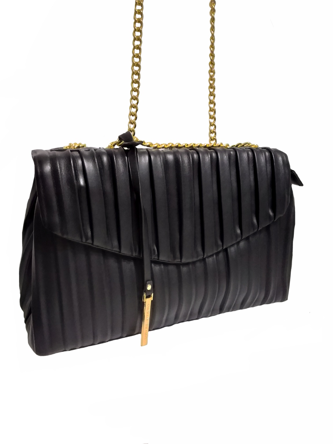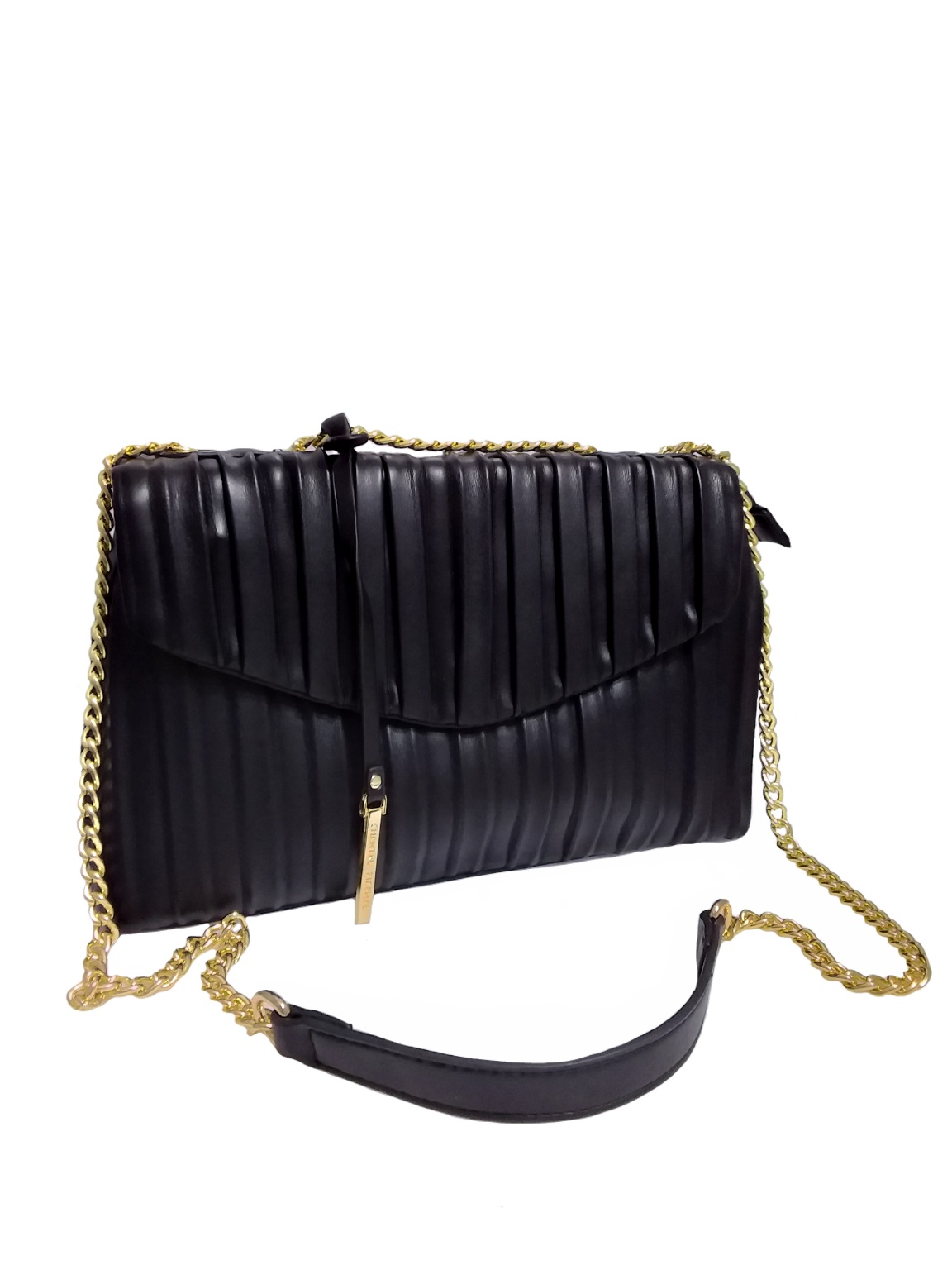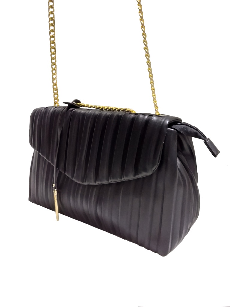 Γυναικεία τσάντα ώμου- χιαστί μαύρο χρώμα . Πλισέ εξωτερικό με διακοσμητικό μεταλλικό κρεμαστό, Ενιαίος εσωτερικός χώρος