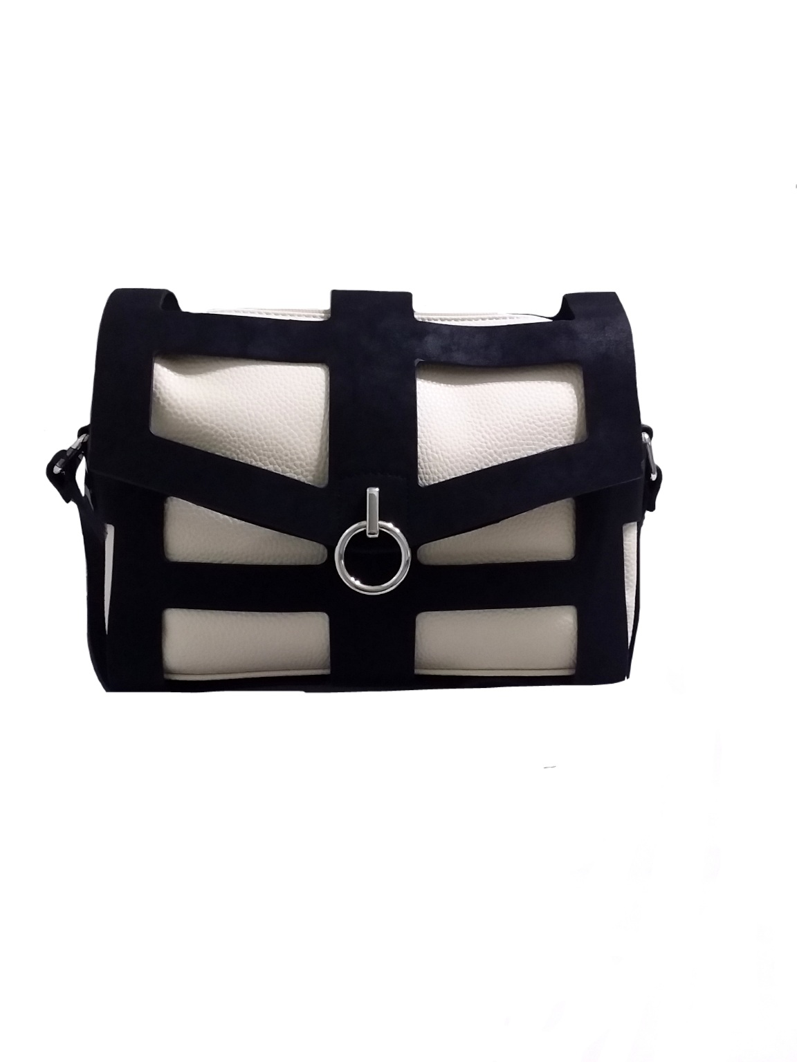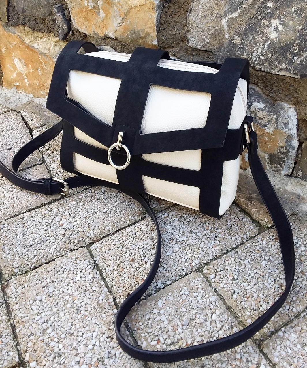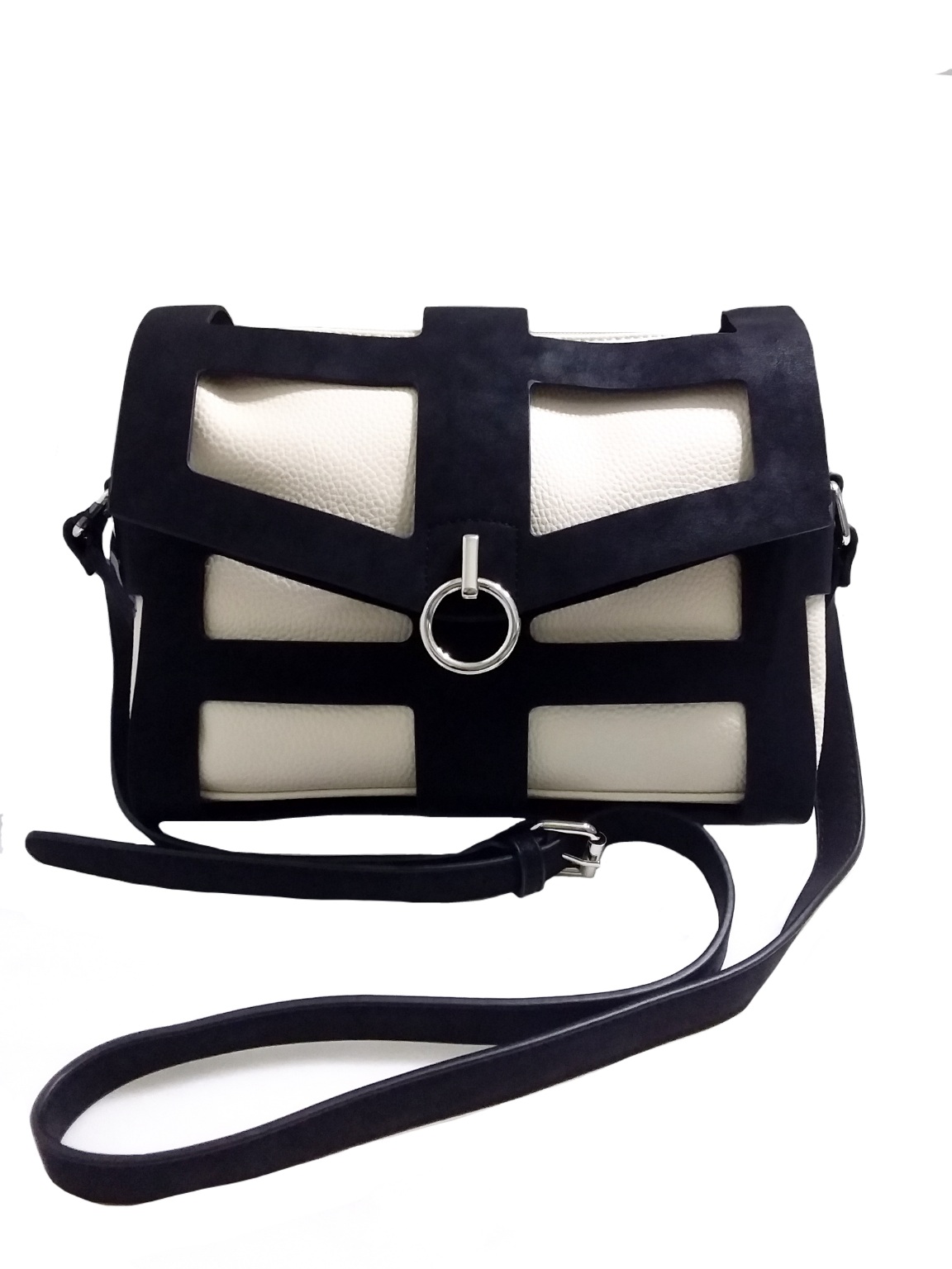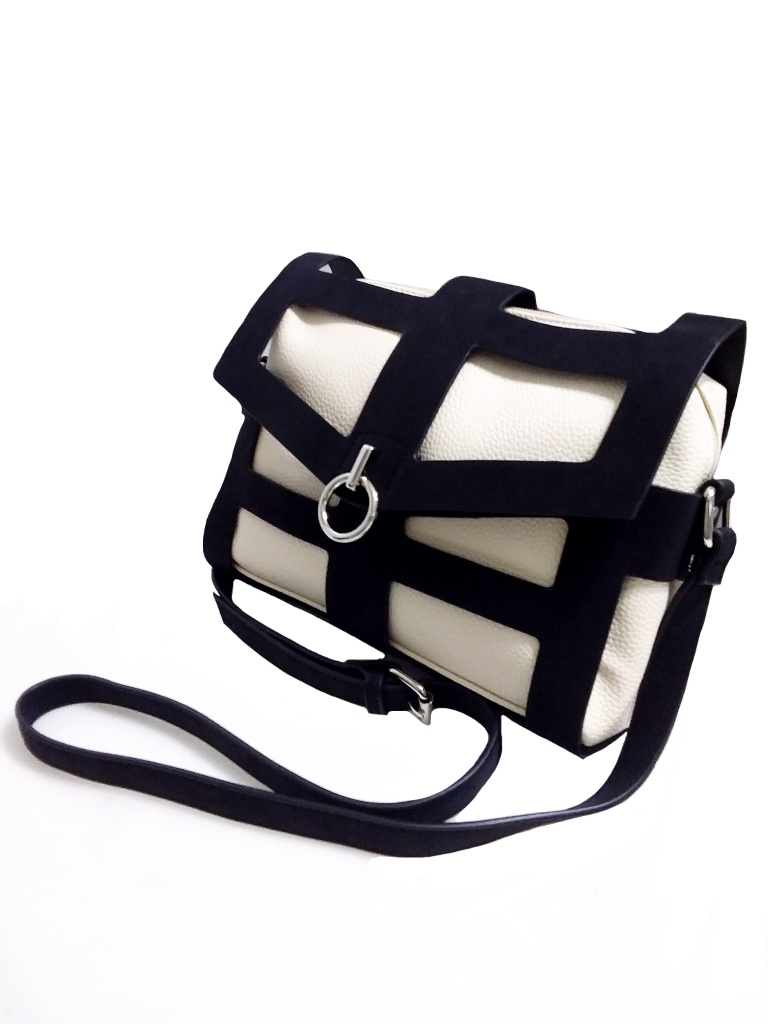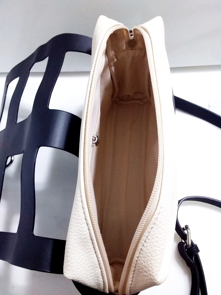 Γυναικείο τσαντάκι χιαστί ασπρόμαυρο το οποίο αποσπώντας το μαύρο μέρος ,παραμένει μόνο λευκό χιαστί ή ενα υπέροχο λευκό νεσεσέρ. Ενιαίος εσωτερικός χώρος με μικρά τσεπάκια