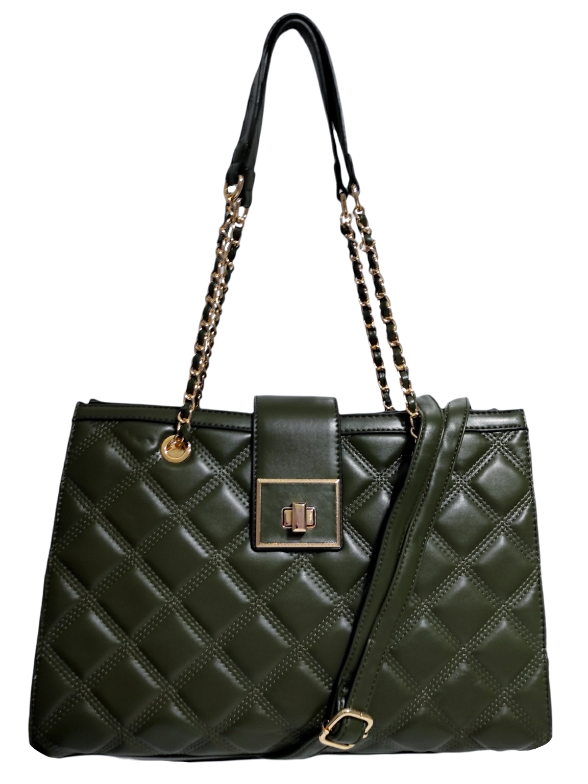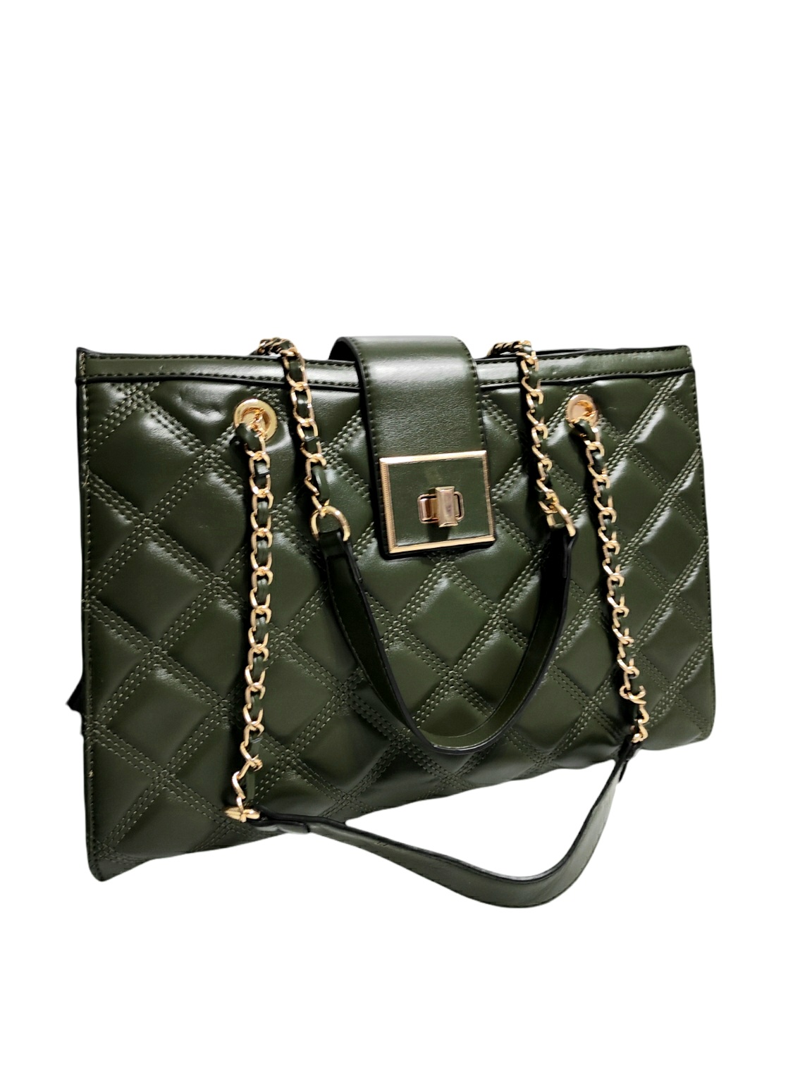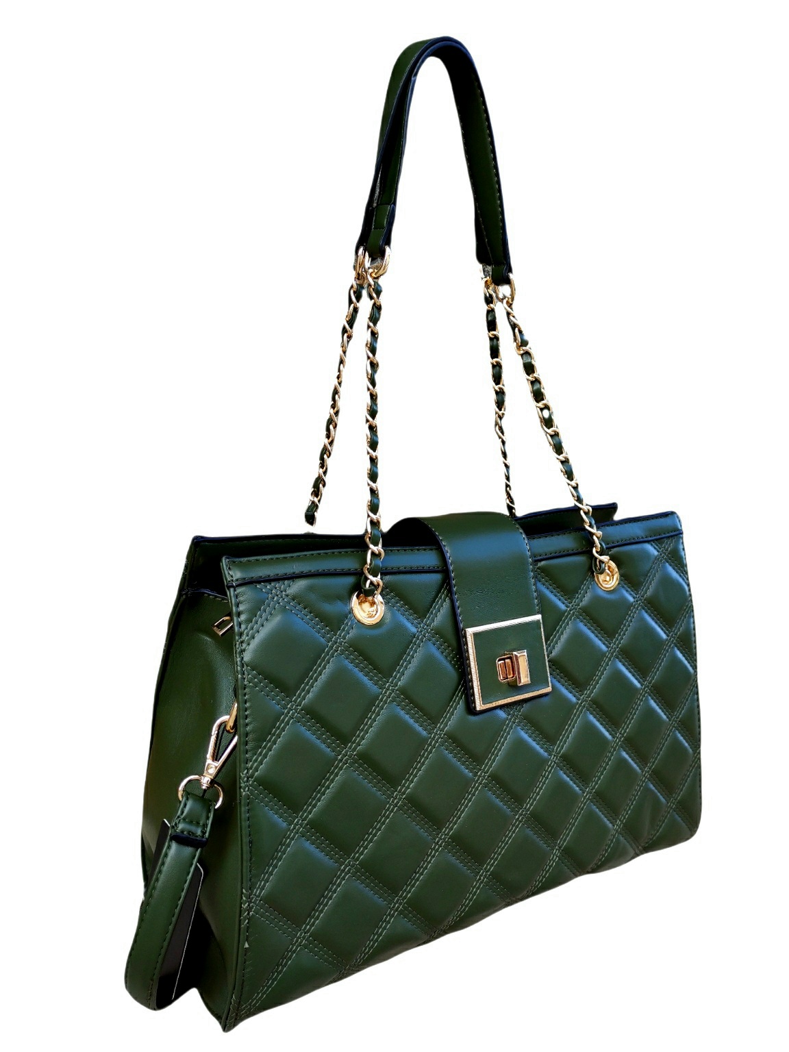 Γυναικεία τσάντα ώμου πράσινο χρώμα καπιτονέ με μεταλλικό κούμπωμα.Ενιαίος εσωτερικός χώρος με μικρά τσεπάκια εντός.Διαθέτει επιπλέον λουρί,για να φορεθεί χιαστί.